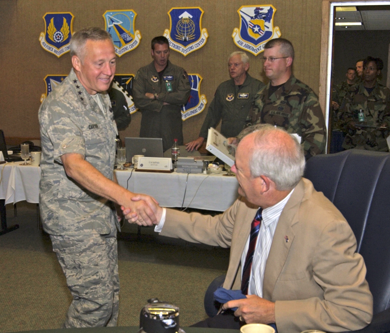 Gen. Bruce Carlson, Air Force Materiel Command commander, greeted Secretary of the Air Force Michael W. Wynne as senior leaders from across the Air Force met at AFMC headquarters Thursday, July 13. The meeting, known as CORONA TOP, is one of the three CORONA meetings each year where Air Force senior leaders gather to discuss a variety of important issues. In addition to Secretary Wynne, Wright-Patterson played host to Air Force Chief of Staff T. Michael Moseley and some 75 general officers from across the Air Force. (Air Force photo by Spencer P. Lane)