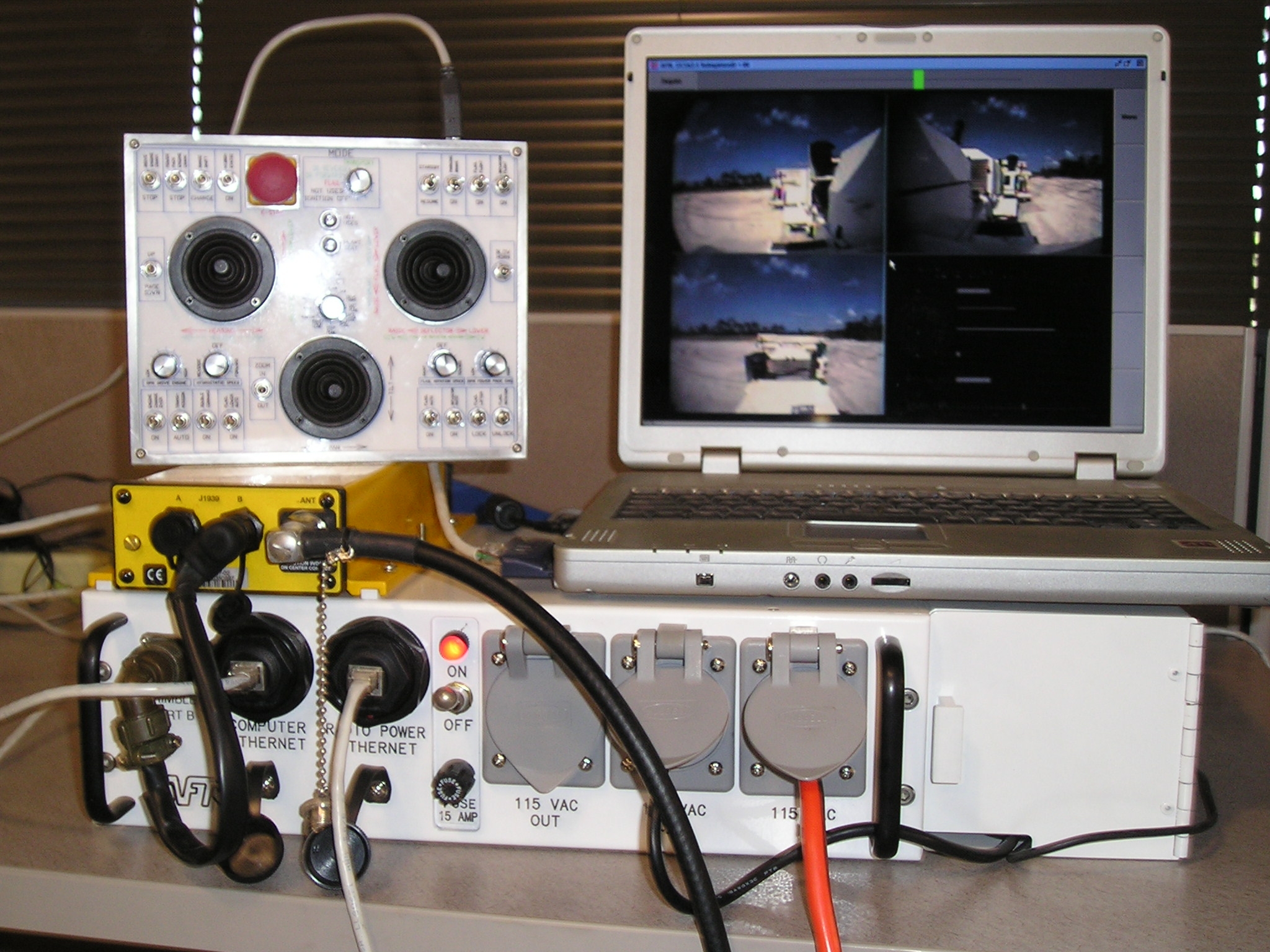 TYNDALL AIR FORCE BASE, Fla. — A remote control system was developed for the Mine Area Clearance Vehicle by the Air Force Research Laboratory Materials and Manufacturing Directorate Airbase Technology Division Force Protection Branch. The system includes, clockwise from top left: the joystick box, laptop computer, the white Operator Control Station, and the yellow Trimble Global Positioning System. (Air Force photo)