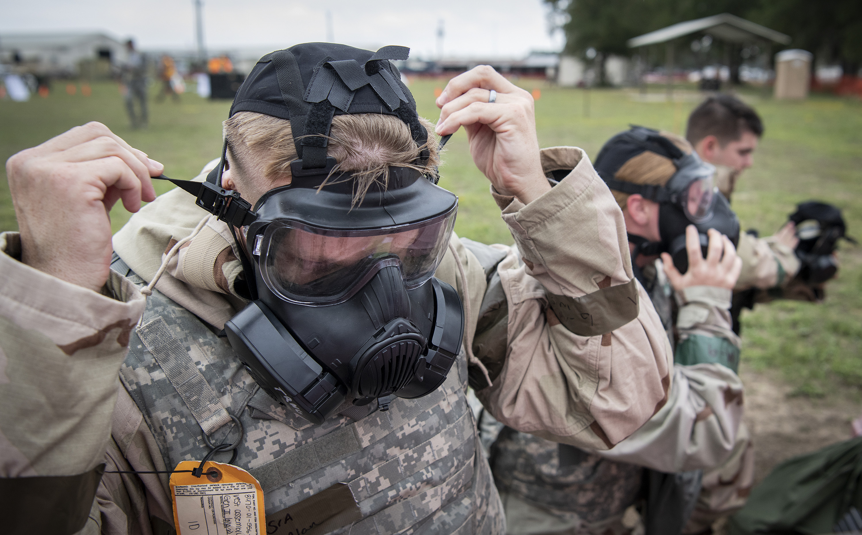 Airmen secure their gas mask in place during a chemical, biological, radiological, nuclear and explosive exercise at Eglin Air Force Base, Fla., Nov. 7. The Air Force Materiel Command evaluation exercised the Airmen’s ability to meet wartime and contingency taskings of employing and sustaining the force and the ability to survive and operate. (U.S. Air Force photo/Samuel King Jr.)