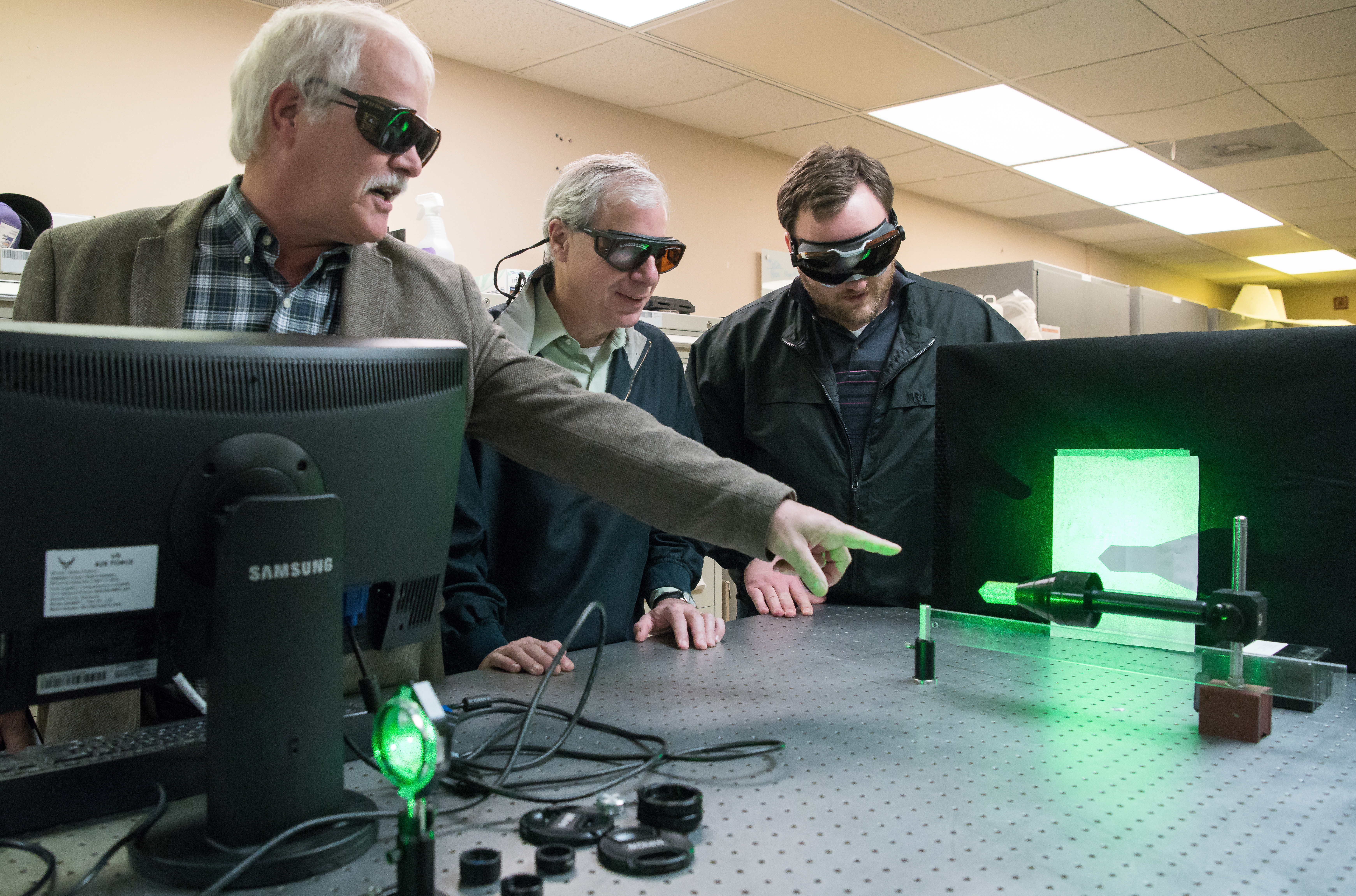 Dr. David Plemmons, left, a senior scientist with the Arnold Engineering Development Complex (AEDC), speaks about the use of a continuous wave laser Jan. 13, 2020, in the Test Technology, Analysis and Evaluation Branch’s Laser Laboratory at Arnold Air Force Base, Tenn. The Branch develops measurement and diagnostic techniques utilizing the lasers in the lab that can then be fielded in AEDC test cells. Also pictured are Dr. Joe Wehrmeyer, center, technical advisor to the Technology Section of the Branch, and Joe Braker, an optical engineer. (U.S. Air Force photo by Jill Pickett)