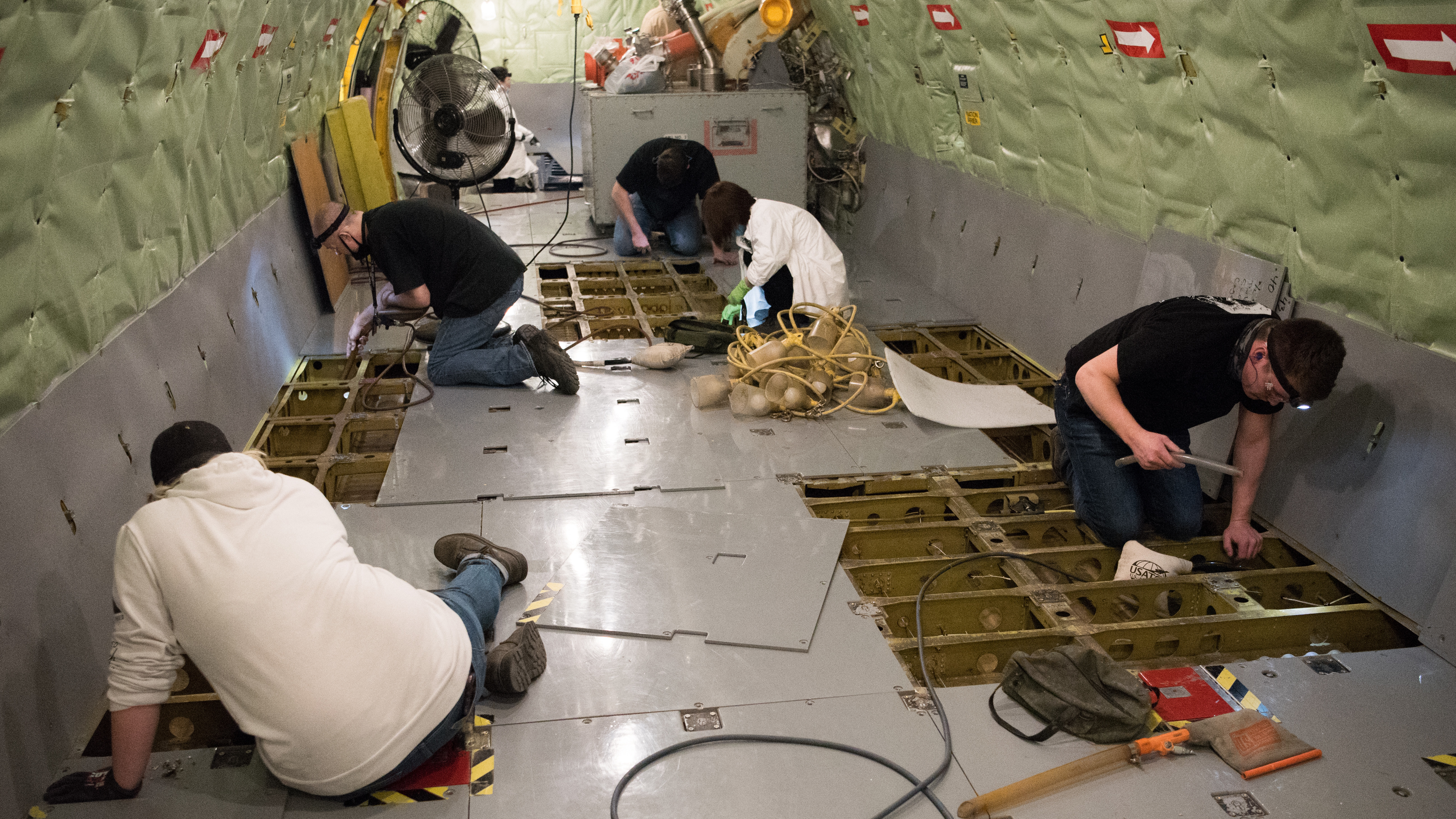 Members of the 564th Aircraft Maintenance Squadron’s sheet metal vocational program work to find and remove foreign objects and debris, known as FOD, onboard a KC-135 Stratotanker aircraft undergoing programmed depot maintenance at Tinker Air Force Base, Okla., March 5, 2021. FOD such as rivets, metal shavings and other debris can be hazardous to aircraft. (U.S. Air Force photo by Paul Shirk)