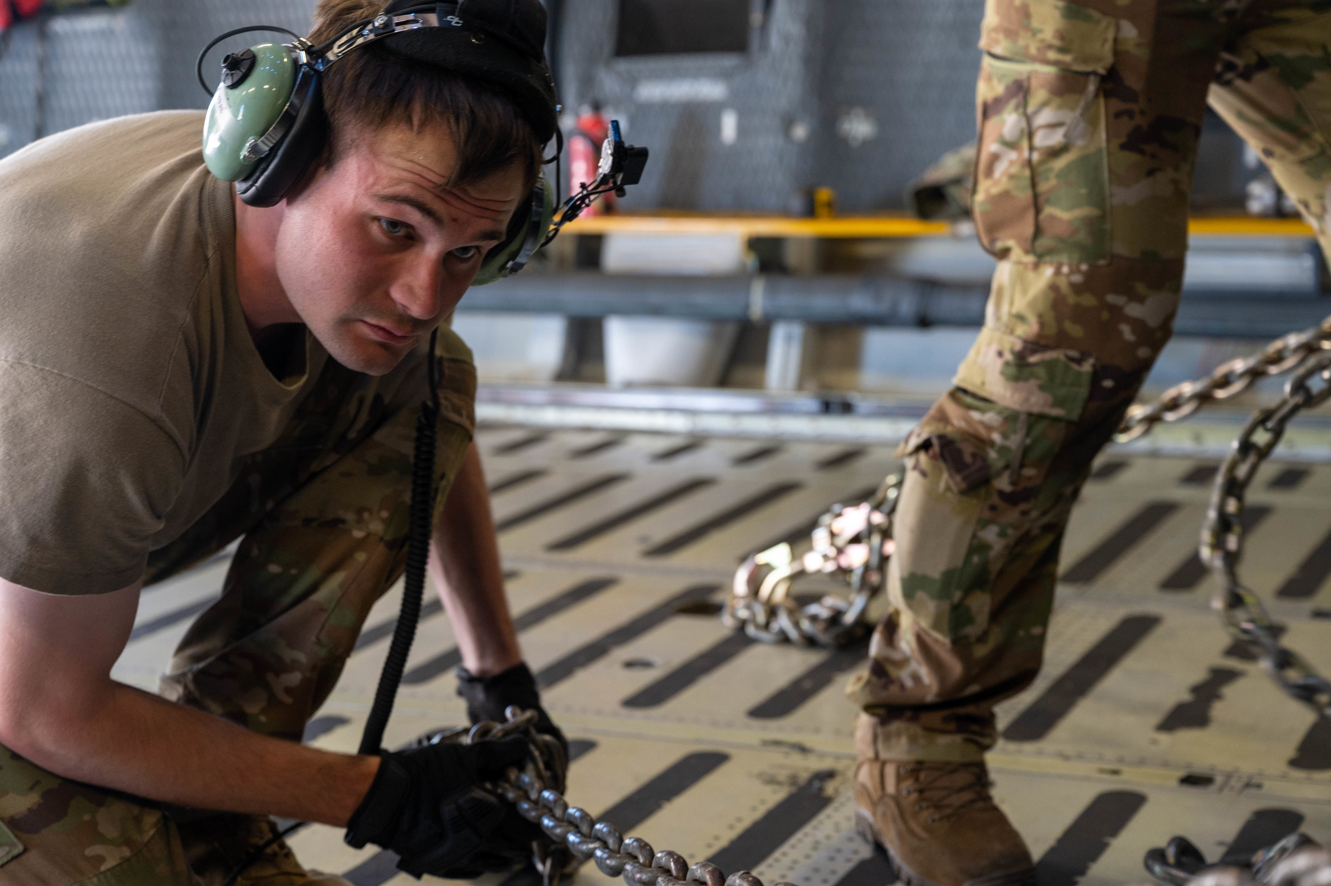 Staff Sgt. John Dittess, 9th Airlift Squadron loadmaster, chains a K-loader to the cargo compartment of a Dover Air Force Base C-5M Super Galaxy during a Major Command Service Tail Trainer at Holloman AFB, June 9, 2021. Loadmasters from the 9th AS coordinated cargo with Airmen from Air Education and Training Command’s 49th Wing and Air Force Materiel Command’s 635th Materiel Maintenance Group to complete the 10-day MSTT. Over the course of the training, Airmen loaded and unloaded 320,085 pounds of cargo, including palletized cargo, aircraft ground equipment, a fuel truck and a K-loader. (U.S. Air Force photo by Senior Airman Faith Schaefer)