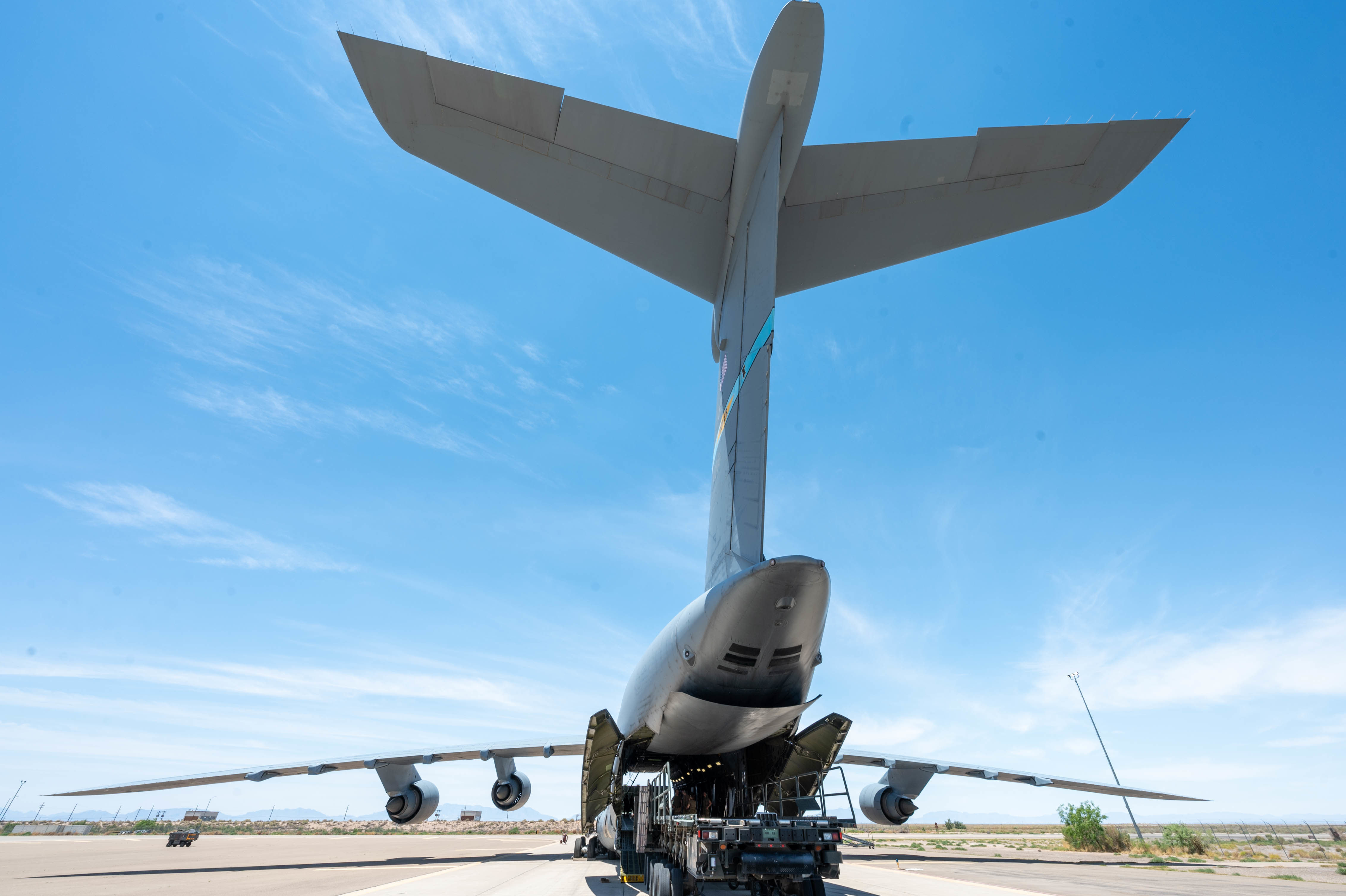 Airmen from the 49th Logistics Readiness Squadron load a K-loader onto a Dover Air Force Base C-5M Super Galaxy during a Major Command Service Tail Trainer exercise at Holloman AFB, New Mexico, June 9, 2021. During the training exercise, Airmen loaded and unloaded 320,085 pounds of cargo, including palletized cargo, aircraft ground equipment, a fuel truck and a K-loader. (U.S. Air Force photo by Senior Airman Faith Schaefer)