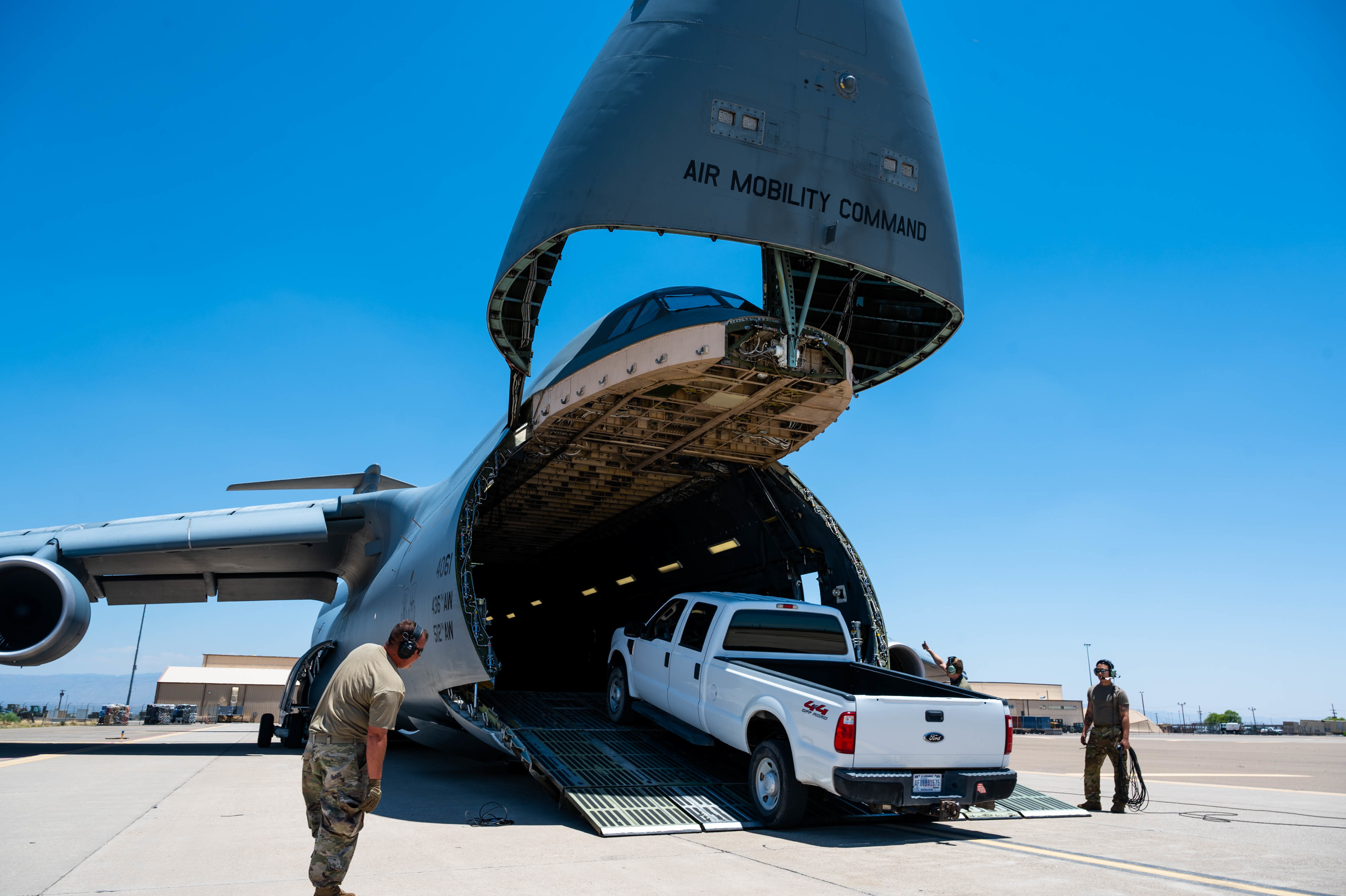 A truck is loaded onto a Dover Air Force Base C-5M Super Galaxy during a Major Command Service Tail Trainer at Holloman AFB, New Mexico, June 7, 2021. The 9th AS performs MSTTs to expedite upgrade and qualification training for C-5M loadmasters and flight engineers. This MSTT was coordinated in partnership with Air Education Training Command’s 49th Wing and Air Force Materiel Command’s 635th Materiel Maintenance Group. (U.S. Air Force photo by Senior Airman Faith Schaefer)